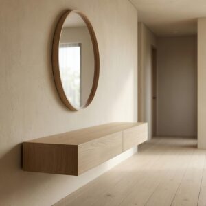 A floating console keeps the hallway visually open and uncluttered. Choose a light wood or matte finish that complements neutral walls. The elevated design enhances the sense of space, especially in compact areas.