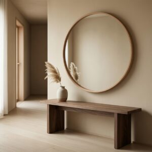 Style the surface with a round mirror and one or two sculptural objects. Keep storage hidden to maintain a clean look. This idea blends Scandinavian simplicity with Japanese restraint for a balanced, functional entryway.