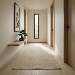 Ensure the rug is simple and free of bold patterns. The understated detail enhances comfort and quiet sophistication. This small addition makes the hallway feel more welcoming and thoughtfully styled.