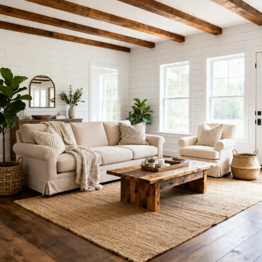 White walls paired with warm wood tones create the foundation of modern farmhouse design. The crisp white brightens the space while wood accents add natural warmth and character. This balance keeps rooms feeling airy yet inviting.