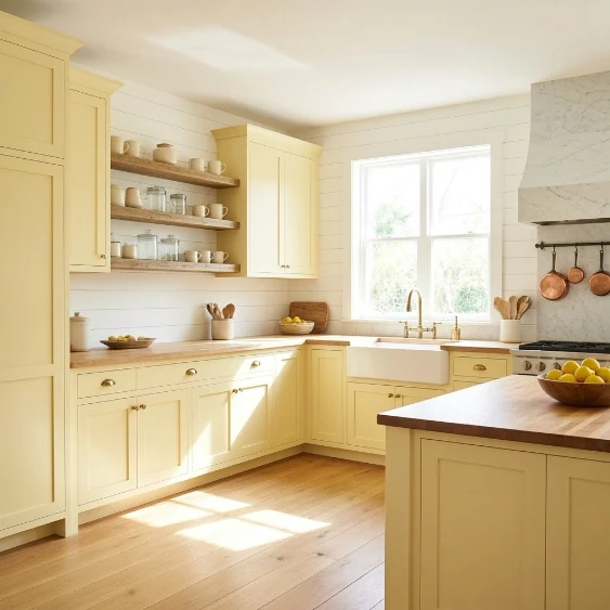 Buttercream yellow brightens farmhouse interiors beautifully. Paired with white, it creates a cheerful and welcoming vibe.