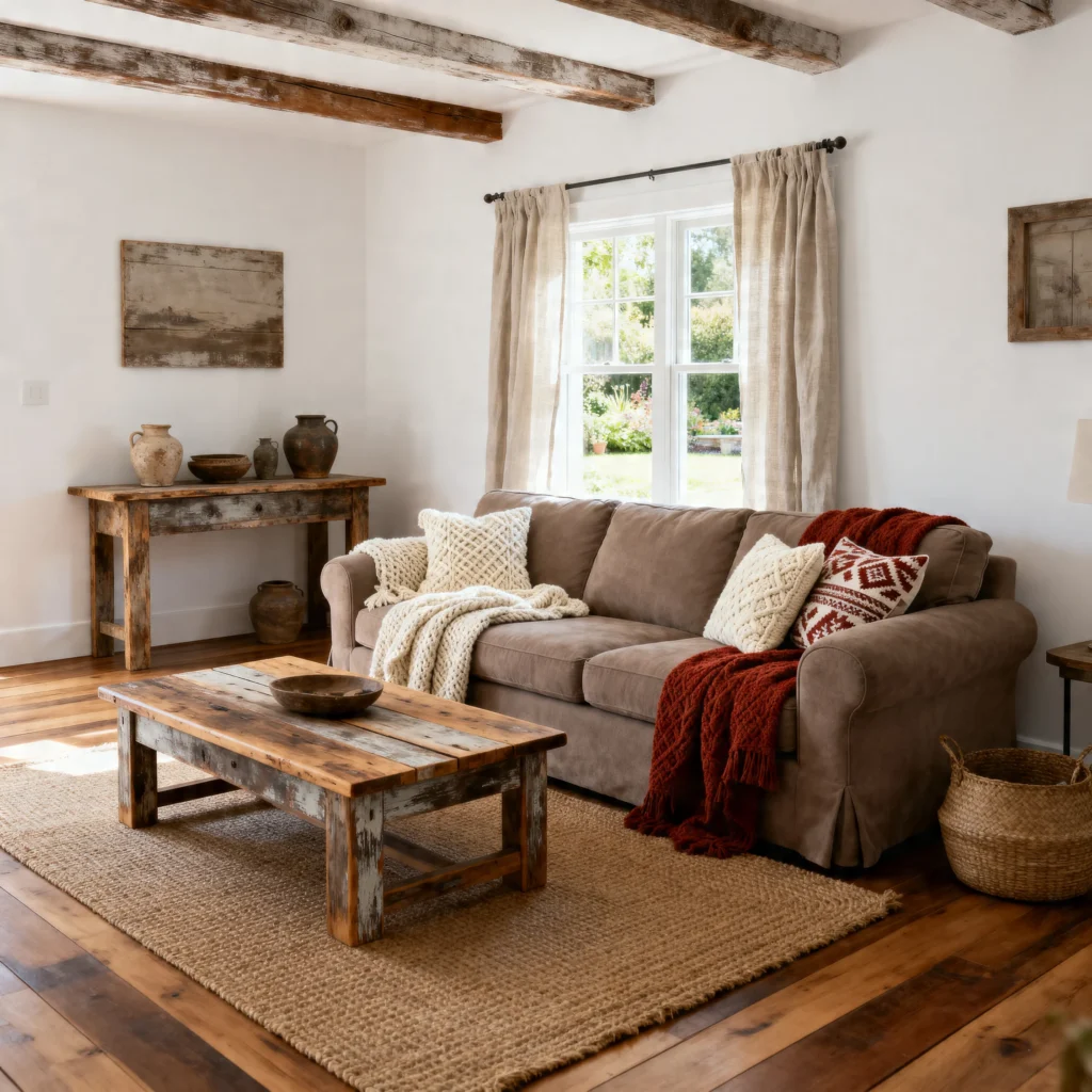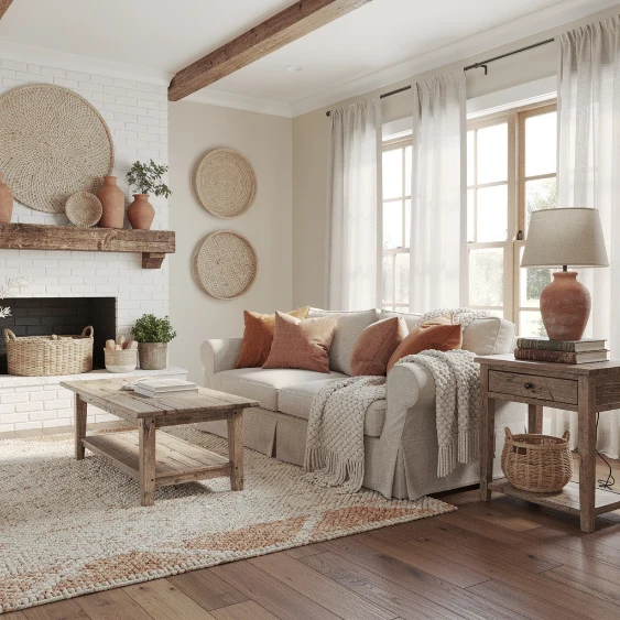 Add terracotta through pottery, textiles, or accent furniture. This palette feels rustic and inviting.
