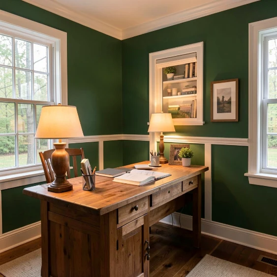 Forest green adds depth and drama while staying nature-inspired. White trim keeps the look crisp and balanced.