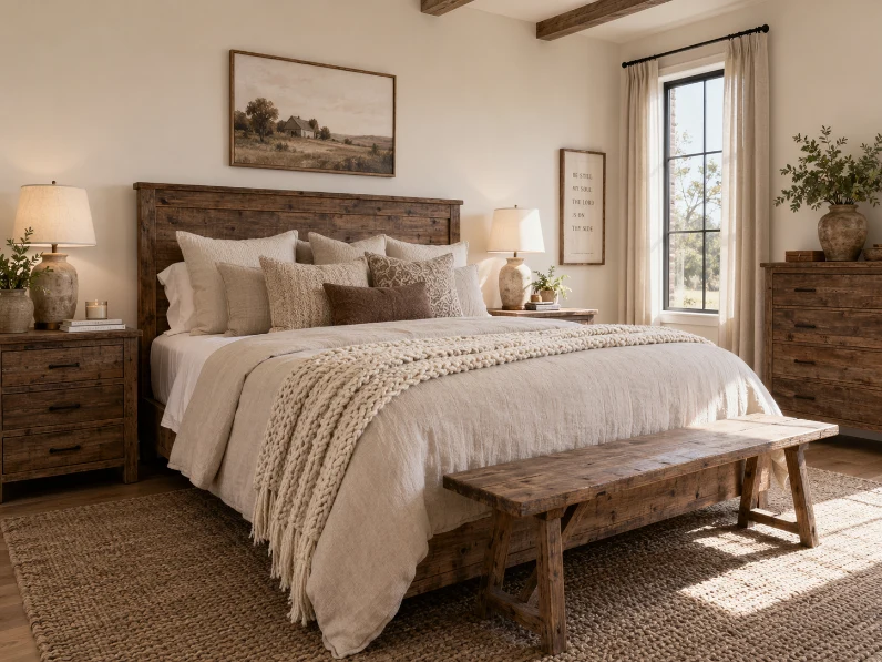 Cream and beige tones create a gentle, cozy backdrop for farmhouse interiors. These soft neutrals bring warmth without feeling heavy, making them perfect for bedrooms and living areas.