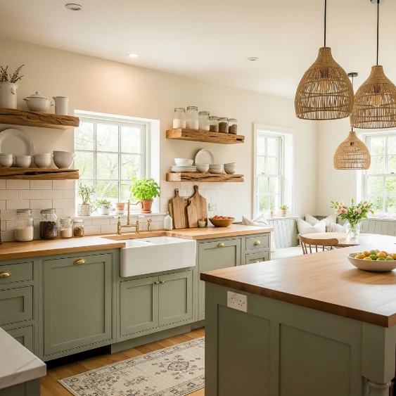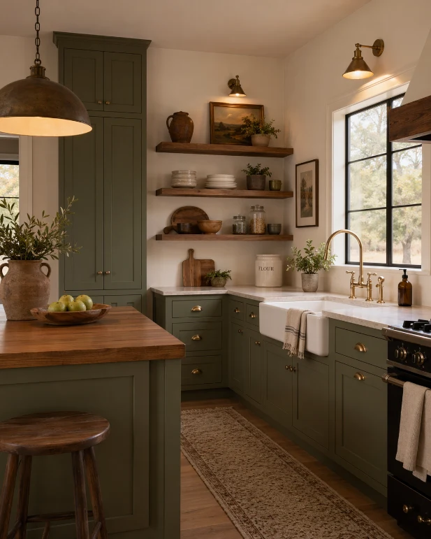 Olive green brings earthy richness to farmhouse design. Cream softens the tone and keeps the palette bright.