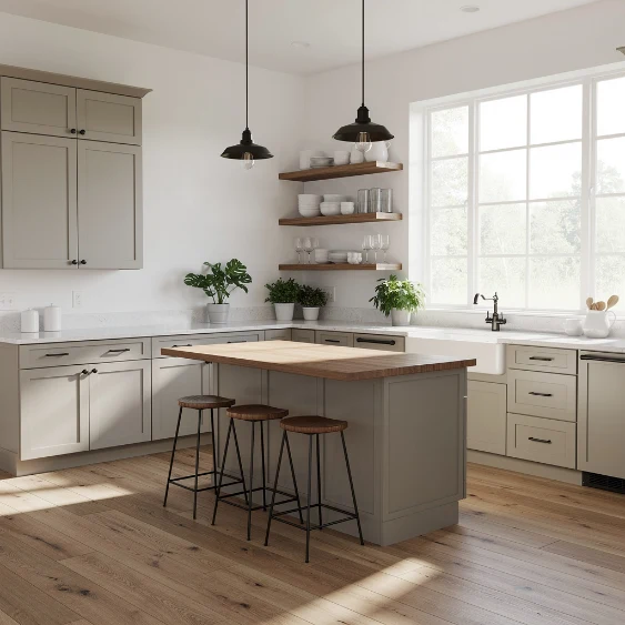 Greige blends gray and beige for a sophisticated neutral base. Paired with white trim or walls, it creates a refined yet welcoming farmhouse aesthetic.