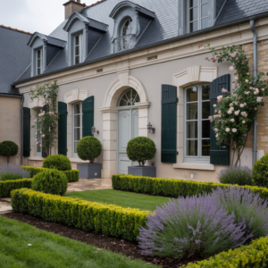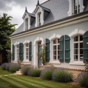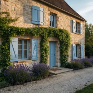 Lavender gardens and stone pathways enhance the romantic countryside vibe. The soft blue tone complements natural greenery and brings a refreshing touch to the exterior. This style is ideal for homeowners who want a bit of color while keeping the elegance and restraint typical of French country architecture.