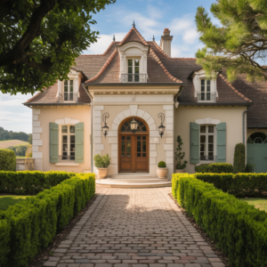 Gravel driveways and subtle landscaping help maintain the relaxed countryside aesthetic. Keep plantings simple with low shrubs and seasonal blooms that frame the entryway without overpowering it. This style works beautifully for homeowners who love clean lines but still want that unmistakable French provincial warmth and architectural charm.