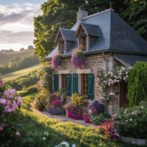 Surround the cottage with climbing roses and a meandering garden path to enhance its romantic appeal. Soft sunrise lighting highlights the texture of stone walls and adds to the dreamy atmosphere. This exterior style works wonderfully for smaller homes or guesthouses, offering personality, charm, and timeless beauty without feeling overwhelming or overly ornate.