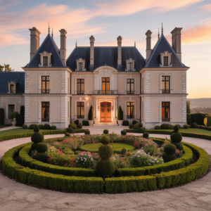Manicured gardens and warm sunset lighting complete the magical atmosphere. Even with grand proportions, the natural materials and soft color palette keep the home feeling inviting. This exterior style captures everything people love about French country design—timeless elegance, charm, and undeniable curb appeal.