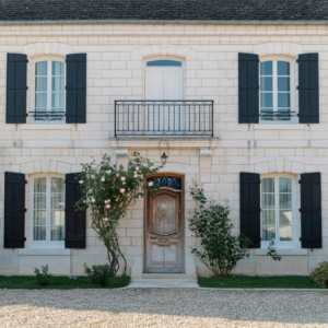 Soft blue shutters against a neutral facade create a gentle pop of color that feels distinctly French. The contrast is subtle but impactful, offering personality without overwhelming the home’s overall design. Paired with white trim and a slate roof, the look feels cohesive and timeless.