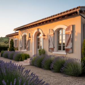 A neutral-toned French country home surrounded by lavender fields feels like a postcard from Provence. Beige stone facades blend seamlessly with natural landscapes, creating harmony between architecture and environment. Wooden shutters and subtle detailing complete the relaxed look.
