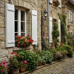 Window boxes overflowing with colorful blooms add instant charm to any French country exterior. Positioned beneath shuttered windows, they create a layered and welcoming appearance. The combination of stone walls, white trim, and vibrant flowers feels cheerful yet elegant, offering a perfect balance between structure and softness.