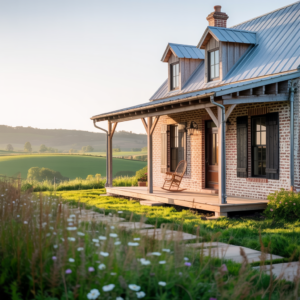 A French country farmhouse combines rustic simplicity with refined architectural elements. Whitewashed brick gives the exterior a soft, aged appearance, while black shutters add subtle contrast. Exposed wood beams and metal roof accents create texture and depth without overpowering the clean facade.