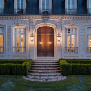 Grand double wooden doors instantly elevate a French country exterior. Framed by an arched stone entryway, they create a stunning focal point that draws attention and sets the tone for the entire home. Iron lanterns on either side provide symmetry and warm illumination in the evening hours.